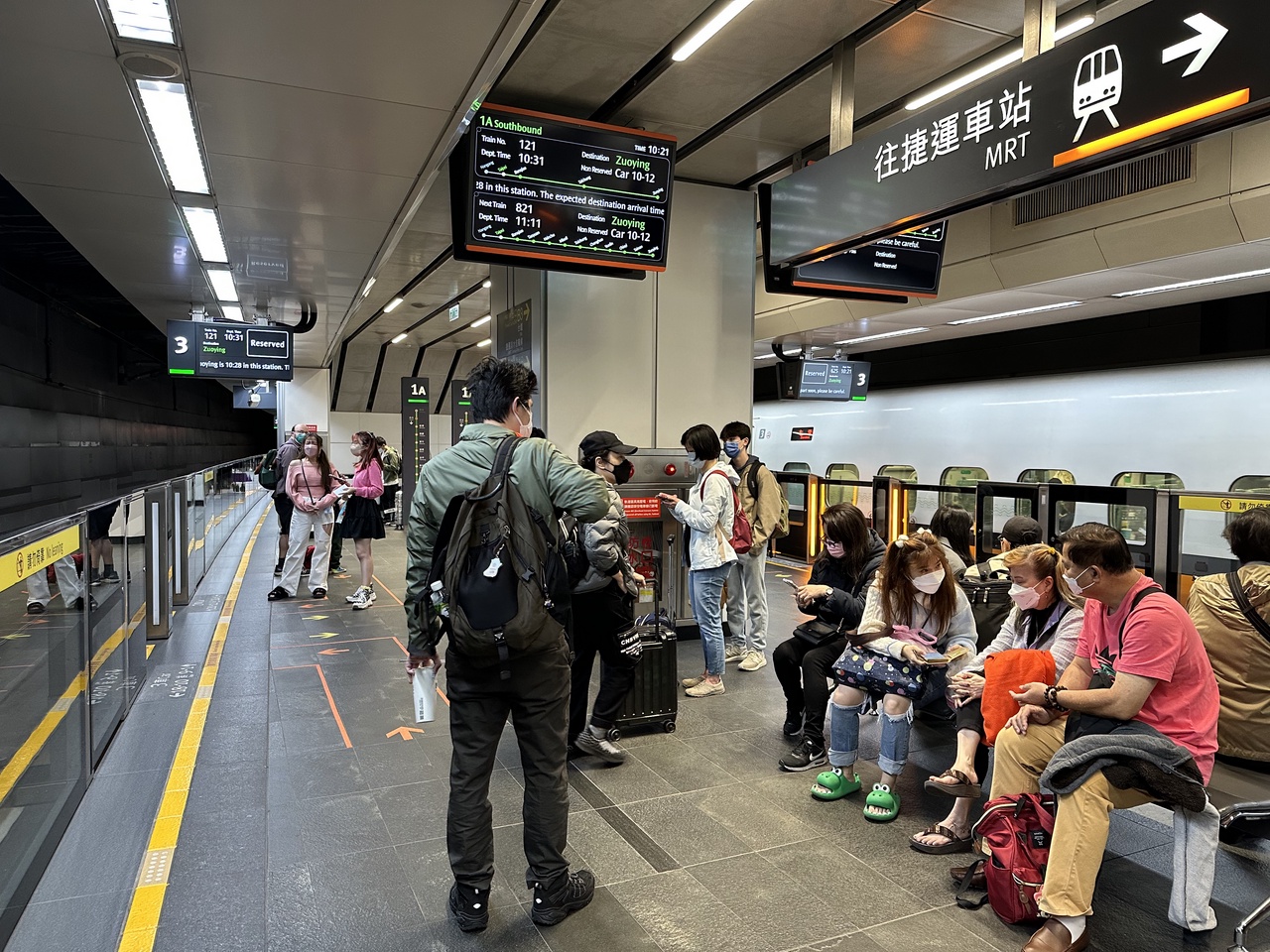 Bahnhof Taipeh, auch hier sind wie überall die Gleise abgesichert, am Boden steht wo man einsteigen darf und eine umgekehrte Wagenreihung gibt es nicht. Bitte beachten: Die Frau mit den Kroko-Doc-Schuhen.