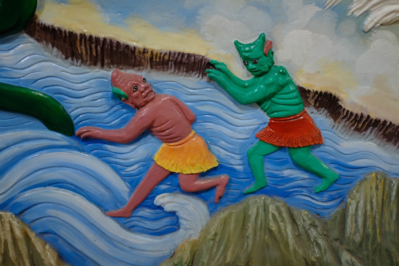 Der grüne Baströckchen-Teufel jagt den 180-Grad-Kopf-Mann, eine alte buddhistische Geschichte, hab ich im Beomeosa Tempel schon gelernt.