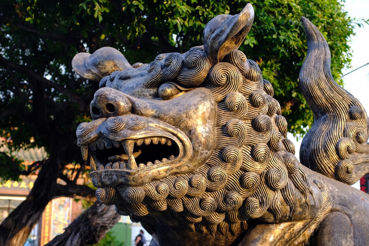 Eigentlich geht man beim Drachen rein und beim Tiger wieder raus, da der Drache aber leider Schuppen verloren hat, ist er gesperrt. Falls Google Translate recht hat.