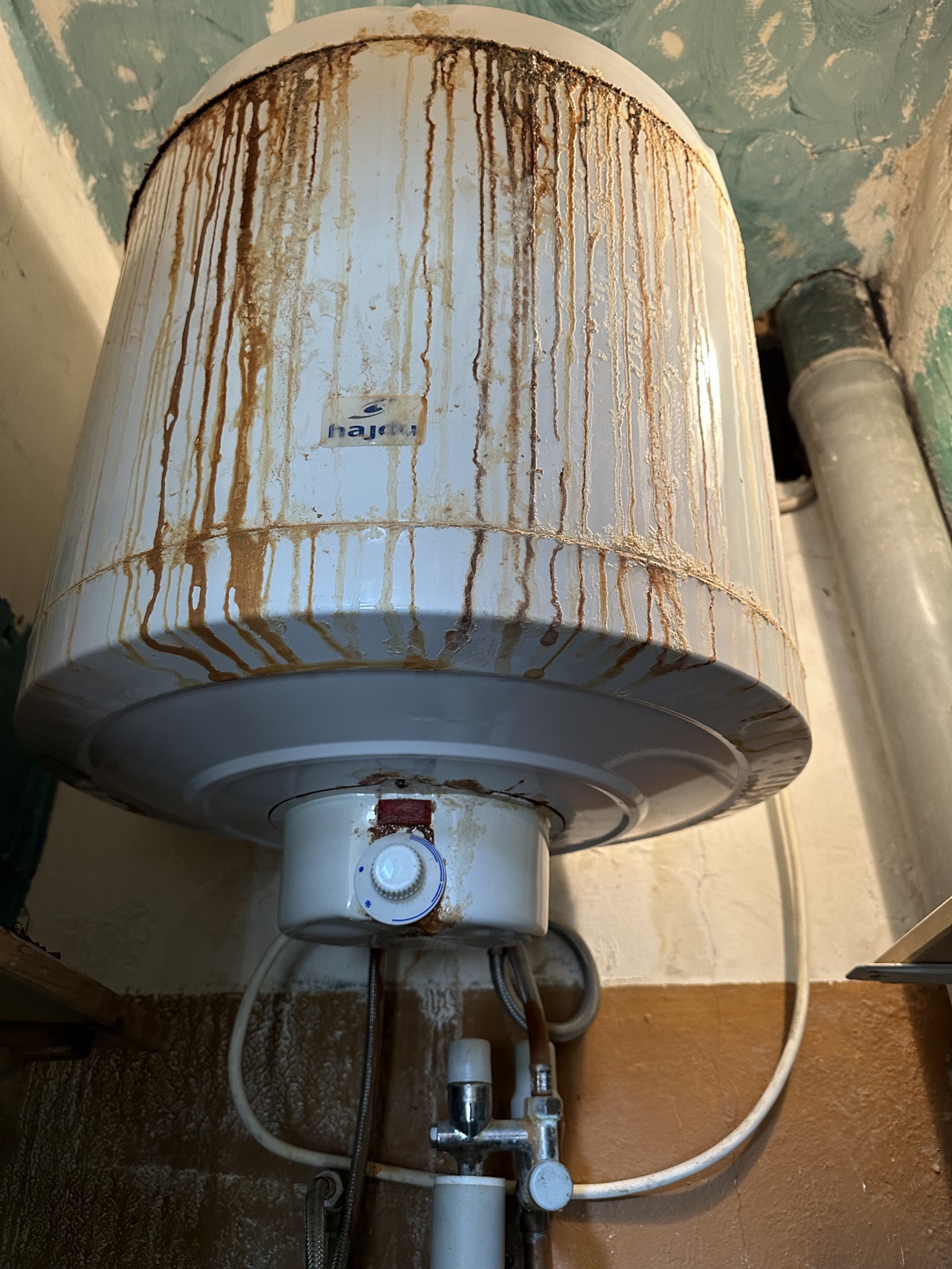 Neben dem rustikal-rostenden Äußeren hatte die Kiste aber noch ein Problem: Sie tropfte. Anfangs ein paar Tropfen die Stunde später immer mehr. Zu diesem Zeitpunkt war auch kein warmes Wasser mehr aus der Kiste zu bekommen. Egal, ich wollte Bodyhacking mit nur-kalt-duschen ja eh schon immer mal ausprobieren. Die Kommunikation mit unserem Vermieter diesbezüglich war… schleppend. Eines Abends kamen wir nach Hause und es kam gar kein Wasser mehr aus der Leitung. Der Nachbar unter uns hatte es abgedreht, da er unglücklich darüber war, dass es aus seiner Decke unkontrolliert regnete. Ich hatte sofort Verständnis für ihn. Über ihn erfuhren wir dann auch, dass unser Vermieter… naja, sagen wir mal so: Es war nicht alles so easy-mobeasy, wie ich dachte, Hashtag mutmaßlichillegaleUntervermietung. Und nach 2 Tagen mit-kaltem-Wasser-und-Eimer-unterm-Boiler wurde uns höchst offiziell das Wasser komplett abgedreht, natürlich ohne Bescheid zu sagen. Zum Duschen und aufs-Klo-gehen lernten wir so die schicke Ernst-Thälmann Schwimmhalle kennen. Nach 2 Tagen zogen wir erst mal eine Woche nach München und nahmen alles von Wert mit, da wir weder wussten, ob wir je wieder einziehen würden, noch, ob unser Wohnungsschlüssel noch passen würde. Konnten wir aber nach einer Woche wieder und fanden dieses Schmuckstück im Kämmerchen: