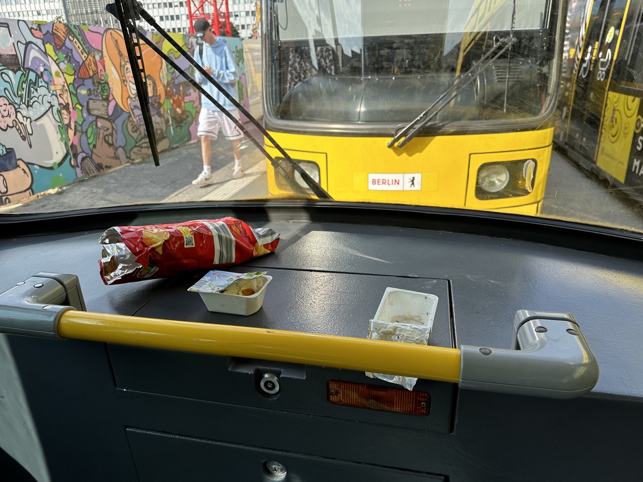Installation ”Chips mit Quark in Straßenbahn M4” Künstler unbekannt, ca. 2023.